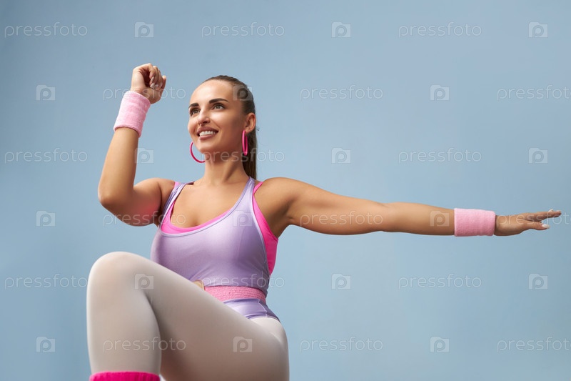 Упражняющаяся женщина в розово-белом фитнес-одежде
