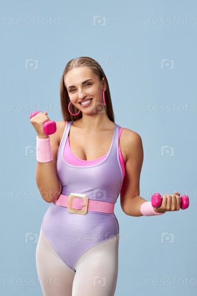 Улыбающаяся женщина упражняется с гантеликами в студии