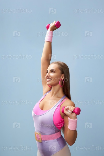 Улыбающаяся женщина занимается с гантеликами в фитнес-одеве