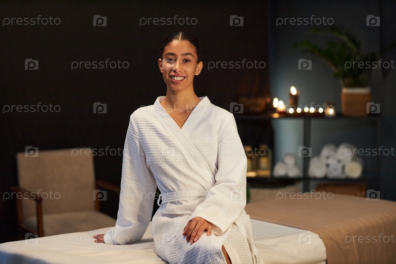 Улыбающаяся женщина сидит в расслабляющей спа-среде