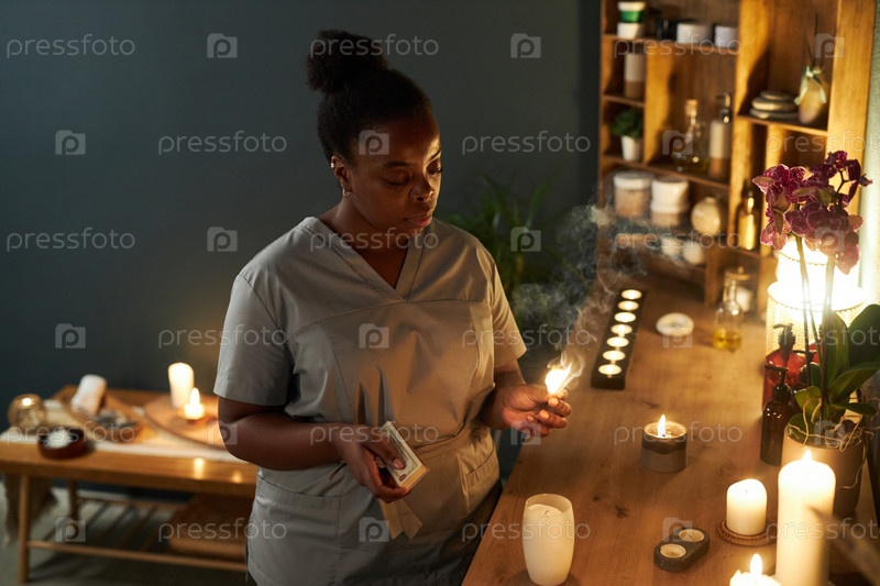 Американская женщина зажигает свечи в уютной спа-установке Африканский
