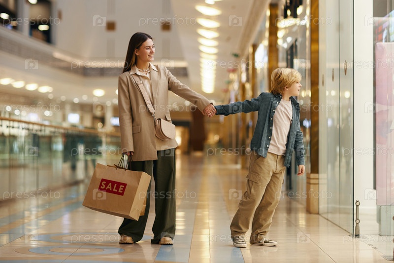 Сын смотрит на витрины магазинов в торговом центре