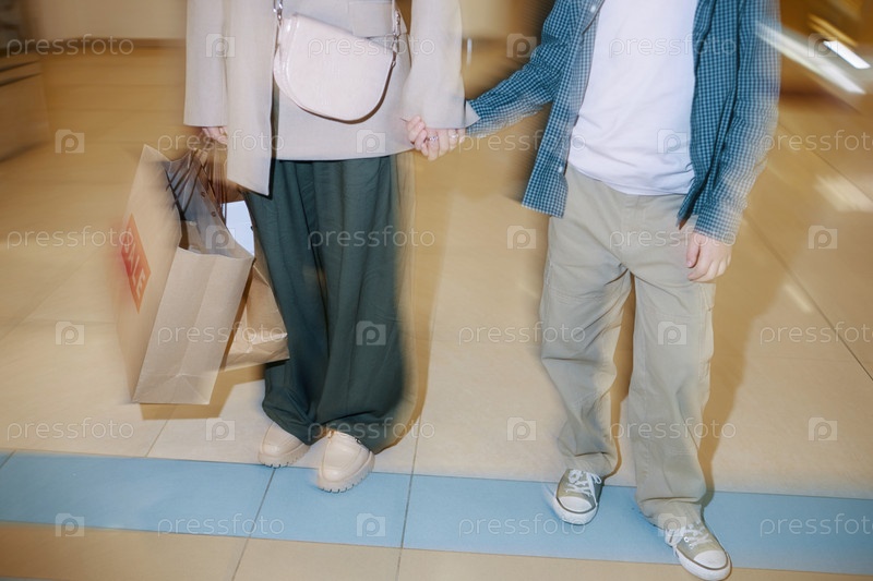 Мама держит сыновей за руки в торговом центре