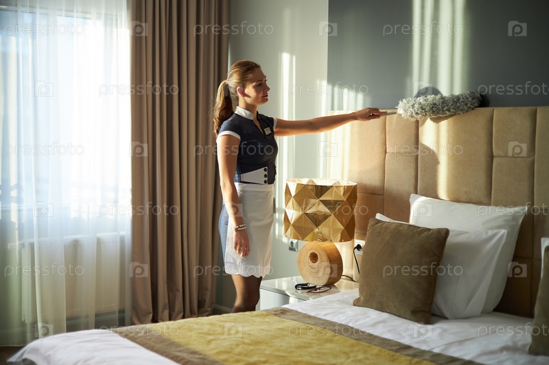 Хозяйка отеля оттирает пыль с головной доски в солнечной комнате