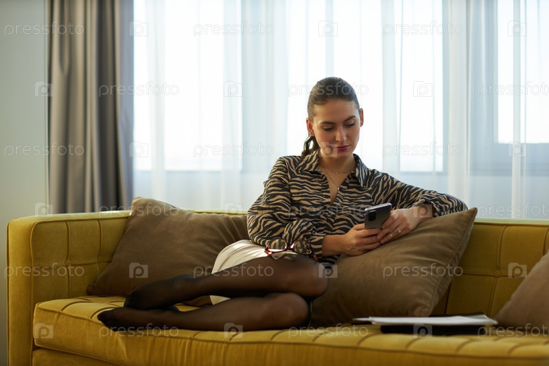 Сидя на желтом диване, проверяю уведомления о смартфонах