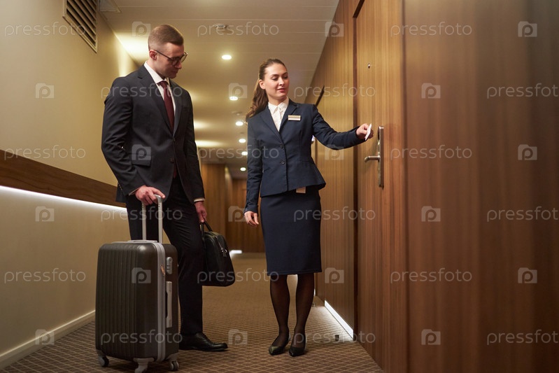 Бизнесмен прибывает в гостиничный номер с багажом