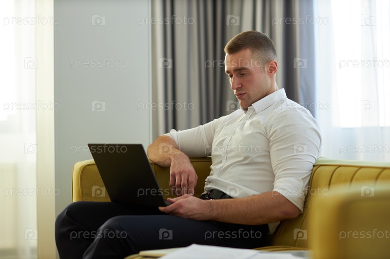 Фокусированный бизнесмен, работающий на ноутбуке, сидящий на диване