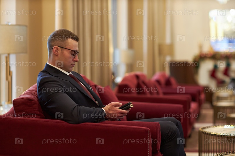 Человек в деловом костюме сидит в лобби роскошного отеля