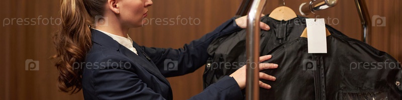 Инспектирование делового костюма для проверки качества в магазине