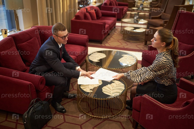 Обсуждение бизнес-стратегии в элегантном гостиничном салоне