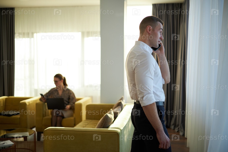 Бизнесмен разговаривает по телефону в современной офисной обстановке