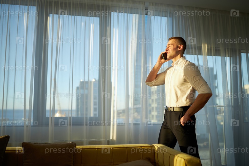 Бизнесмен стоит у окна и разговаривает по телефону