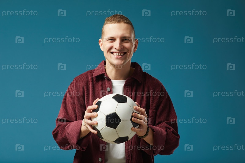 Улыбающийся молодой человек держит футбольный мяч на синем фоне