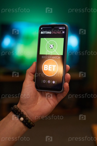 Удерживая смартфон, отображающий интерфейс приложения для ставок рукой