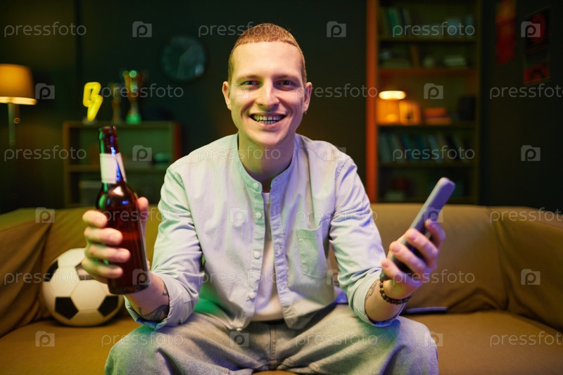 Портрет веселого мужчины, держащего напиток и пульт дистанционного управления