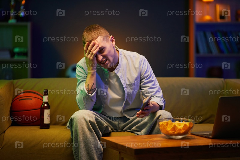 Человек с головной болью, держащий в руках смартфон и бутылку пива