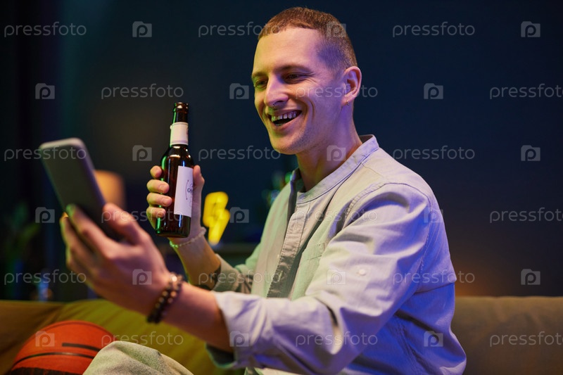 Улыбающийся мужчина наслаждается виртуальным праздником с напитком