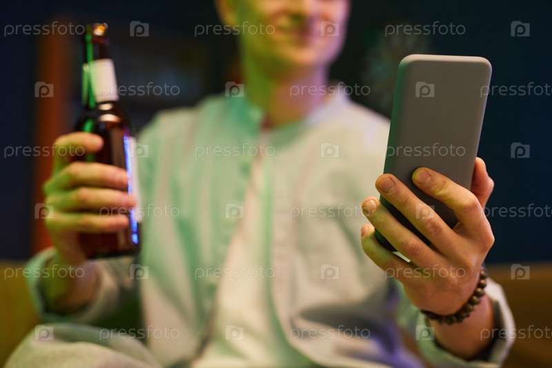 Улыбающийся человек, держащий смартфон и бутылку пива в помещении
