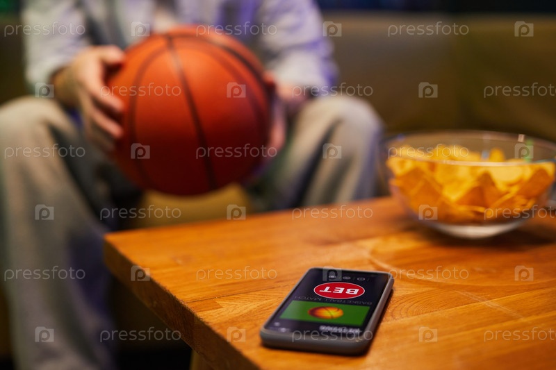 Держите баскетбол рядом с мобильным телефоном с приложением для ставок Open