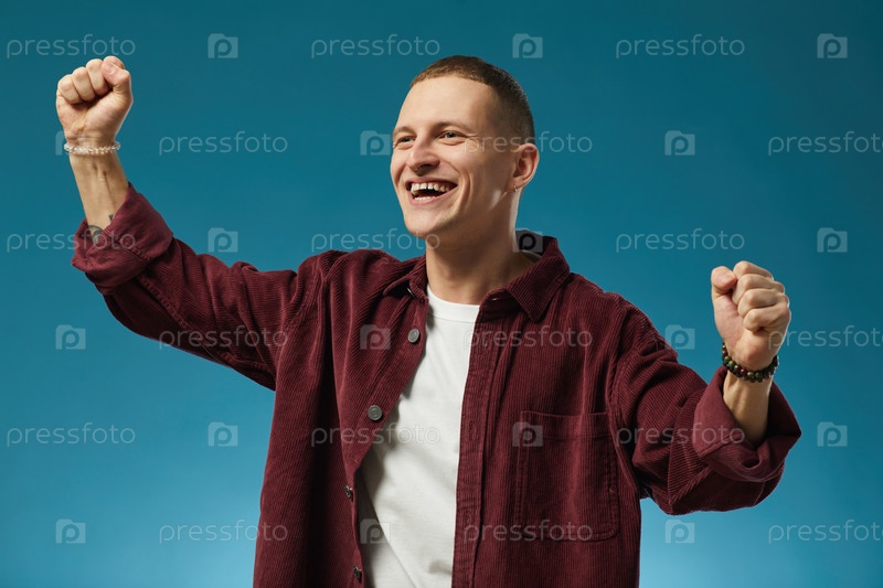 Улыбающийся мужчина празднует с поднятыми руками на синем фоне