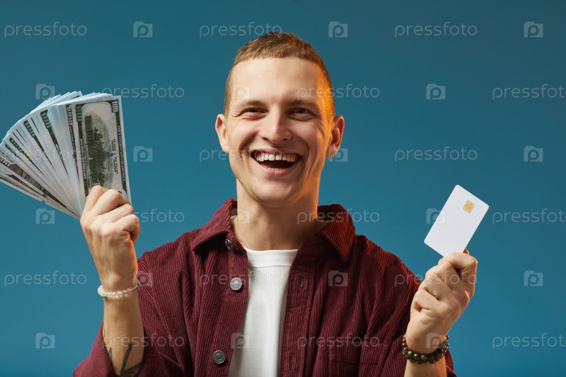 Держать наличные и кредитные карты с веселым выражением лица