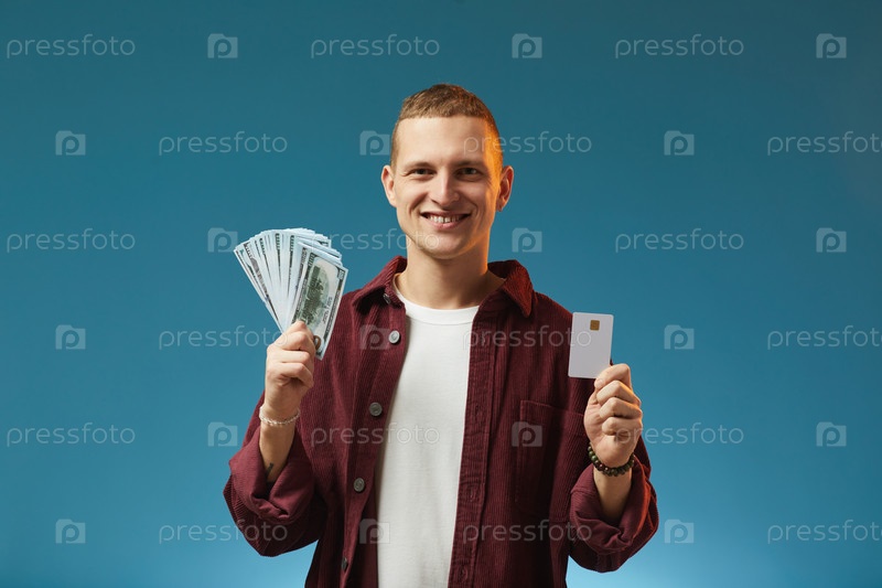 Портрет мужчины, держащего наличные и кредитные карты улыбаясь