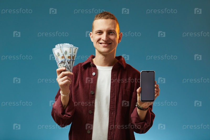 Портрет улыбающегося мужчины, держащего наличные и смартфон