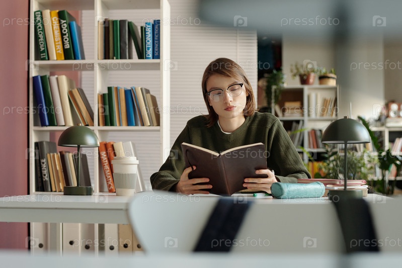 Студентка-женщина читает книгу с очками на столе в библиотеке колледжа
