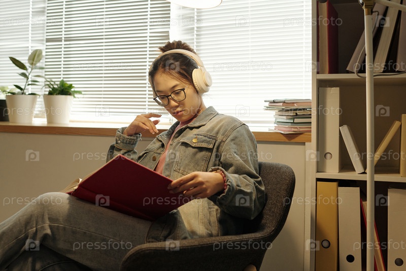 Юная азиатская девочка читает книгу в школьной библиотеке, носящая наушники