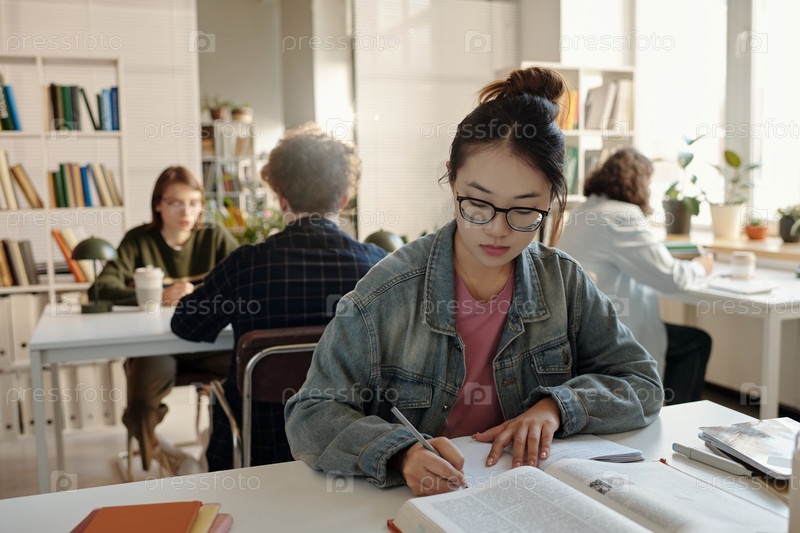 Азиатская женщина учится за столом в школьной библиотеке
