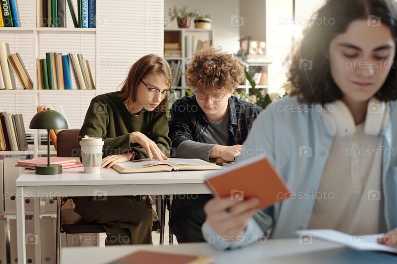 Два студента в библиотеке колледжа готовятся к экзаменам