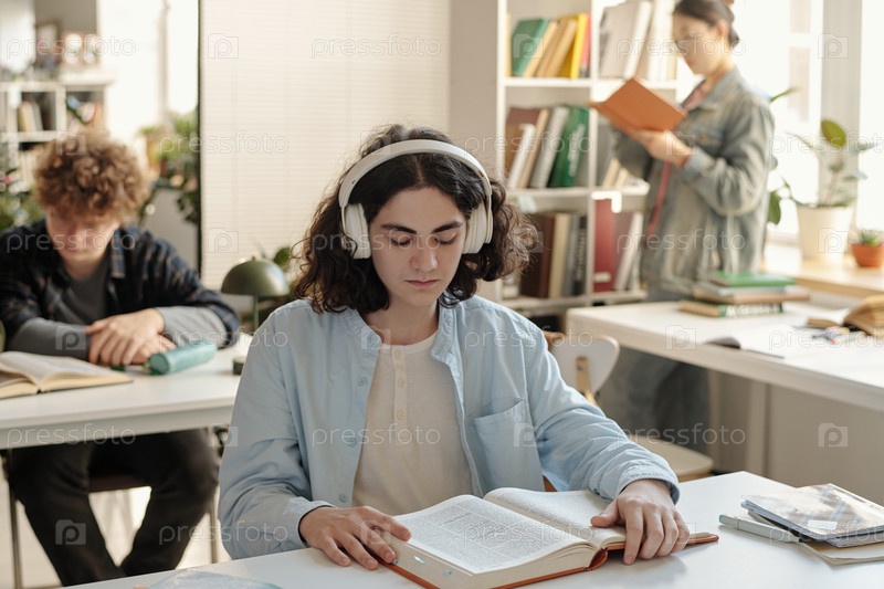 Студент, носящий наушники Учиться за столом в библиотеке колледжа Читать книгу Мужчина