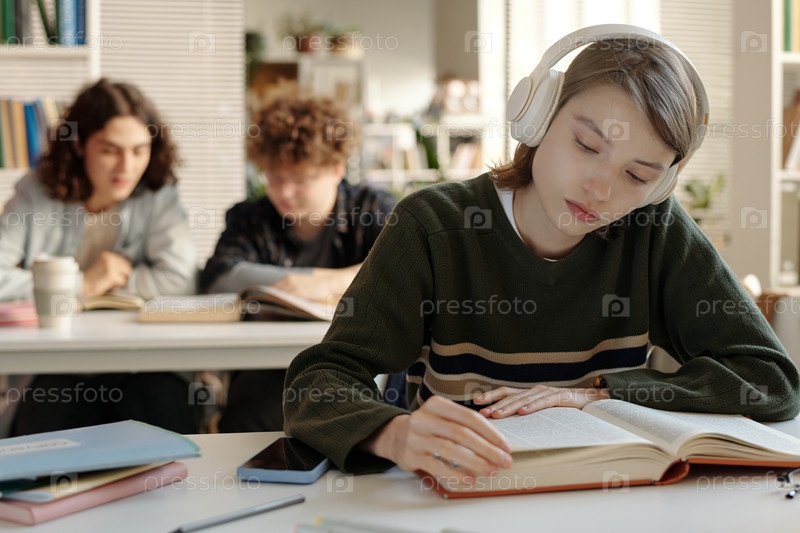 Женщина, носящая наушники в библиотеке колледжа, читает книгу