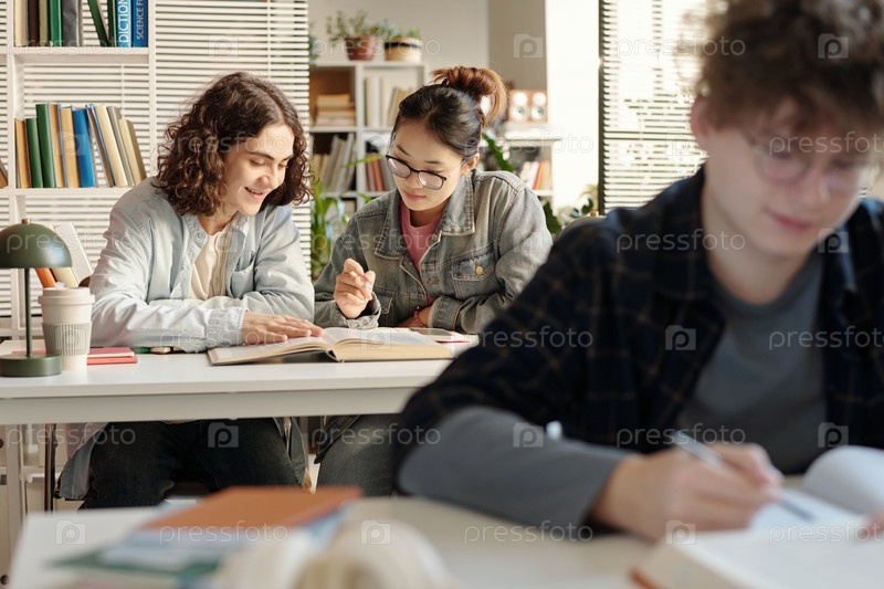 Два студента мальчик и девочка за столом в классе колледжа, готовясь к экзаменам