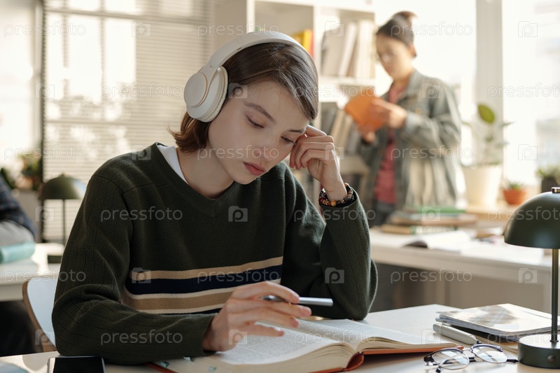 Фокусированная студентка-женщина читает книгу, готовясь к экзаменам