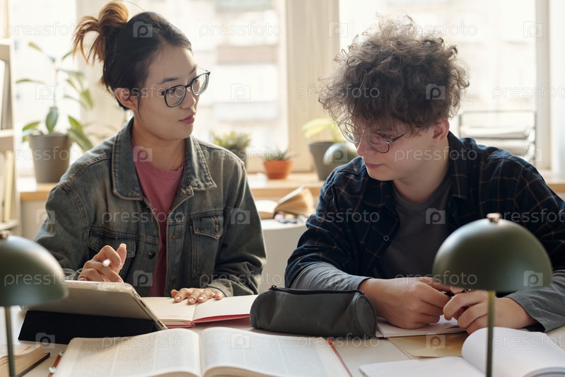 Азиатская женщина объясняет исследовательские тесты своему другу в колледже