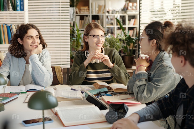Улыбающиеся студенты наслаждаются работой за столом в библиотеке колледжа