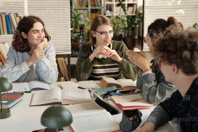 Группа учеников, весело беседующих и работающих за столом в школьной библиотеке