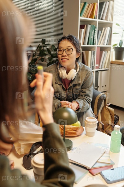Азиатская девочка-подросток общается с друзьями за круглым столом, изучая