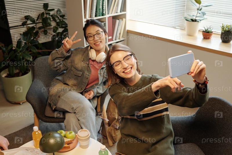 Две улыбающиеся девочки-подростки делают селфи в школьной библиотеке