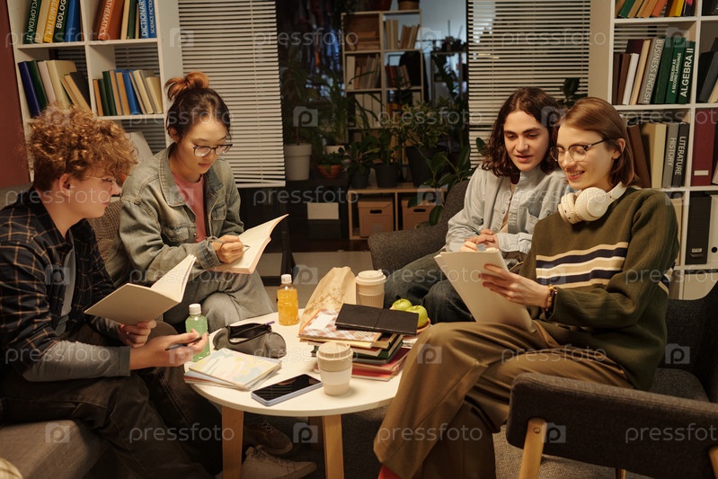 Подростки работают над домашними заданиями в школьной гостиной