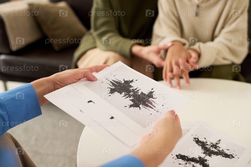 Терапевт показывает тест на чернильные пятна с девочкой-подростком и матерью, которые держатся за руки в фоне
