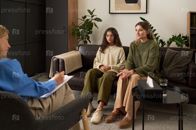 Обеспокоенная мать разговаривает с терапевтом в семейной консультации