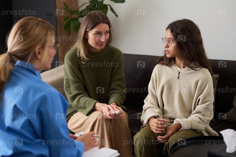 Девушка-подросток разговаривает с матерью в семейном консультировании