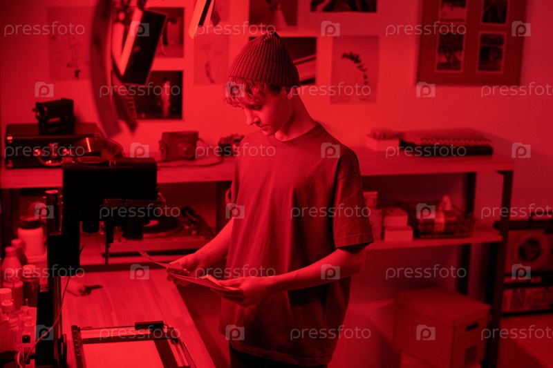 Подросток смотрит на фотоотпечатки в темной комнате