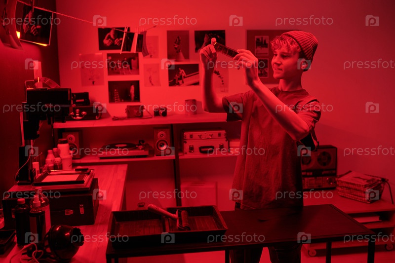 Улыбающийся подросток смотрит на негативы в красном свете рецензирует фильм в темной комнате