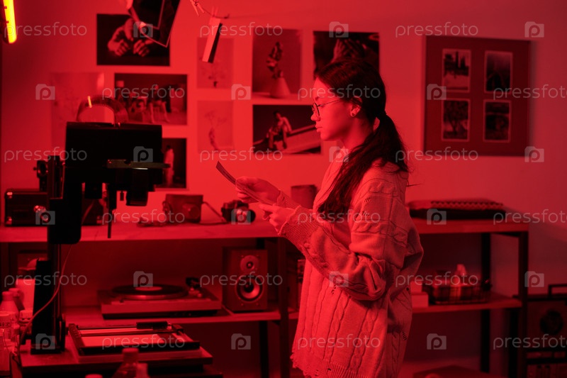 Женщина-фотограф работает с фотографиями, стоящими в темной комнате при красном освещении