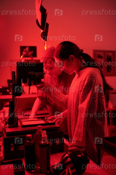 Два подростка работают в темной комнате