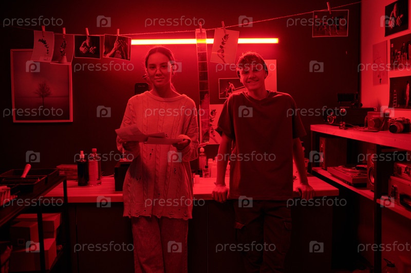 Два фотографа смотрят на камеру в темной комнате, держа фотографические отпечатки