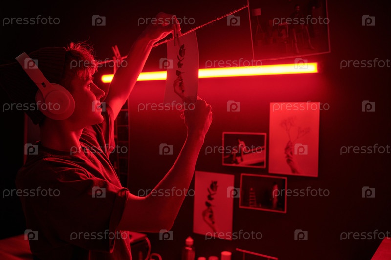 Улыбающийся фотограф вешает фотографии в темной комнате